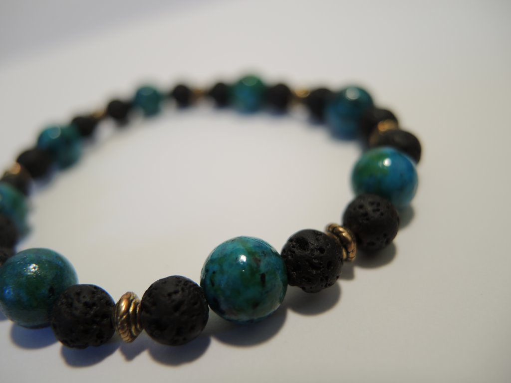 Náramek je z chryzokolu, lávy a bižuterního komponentu zlaté barvy, navlečený na gumičce.