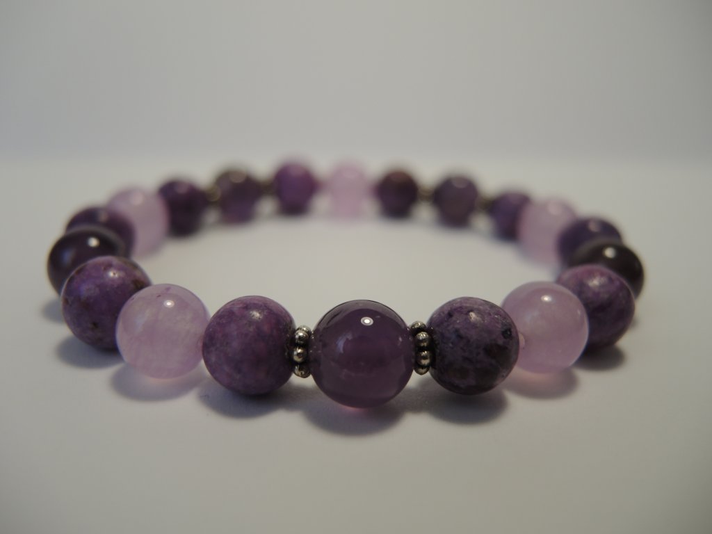 Náramek je z ametystu, jadeitu, jaspisu a drobného komponentu stříbrné barvy, navlečený na gumičce.
